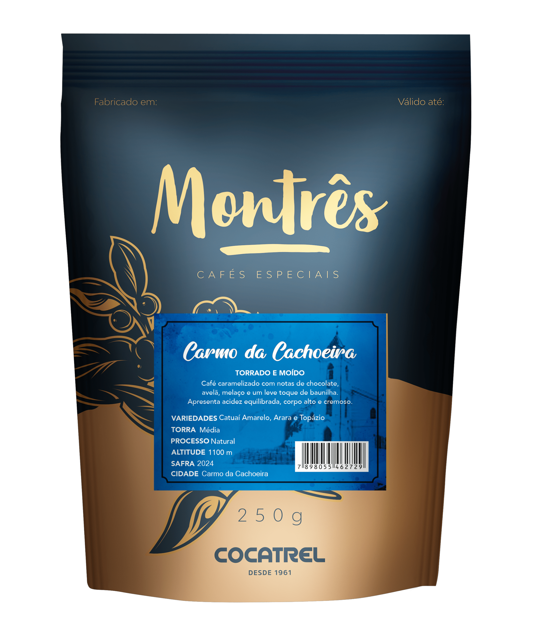 A linha Montrês é feita com cafés 100% arábica, especiais, classificados de acordo com a metodologia da Associação de Cafés Especiais (SCA). São rastreados por variedade e origem (microclima). A versão Carmo da Cachoeira é um café caramelizado com notas de chocolate, avelã, melaço e um leve toque de baunilha. Apresenta acidez equilibrada, corpo alto e cremoso. Cafés cuidadosamente selecionados desde a origem, tornando a sua experiência única a cada xícara. Tudo para que você eleve a um novo patamar o seu conceito sobre cafés especiais. Produzidos no Sul de Minas Gerais, os cafés Montrês utilizam, como matéria-prima, os melhores grãos especiais de café 100% arábica, produzidos de acordo com os princípios do programa 4C. Um encontro de aromas e notas que vai surpreender.