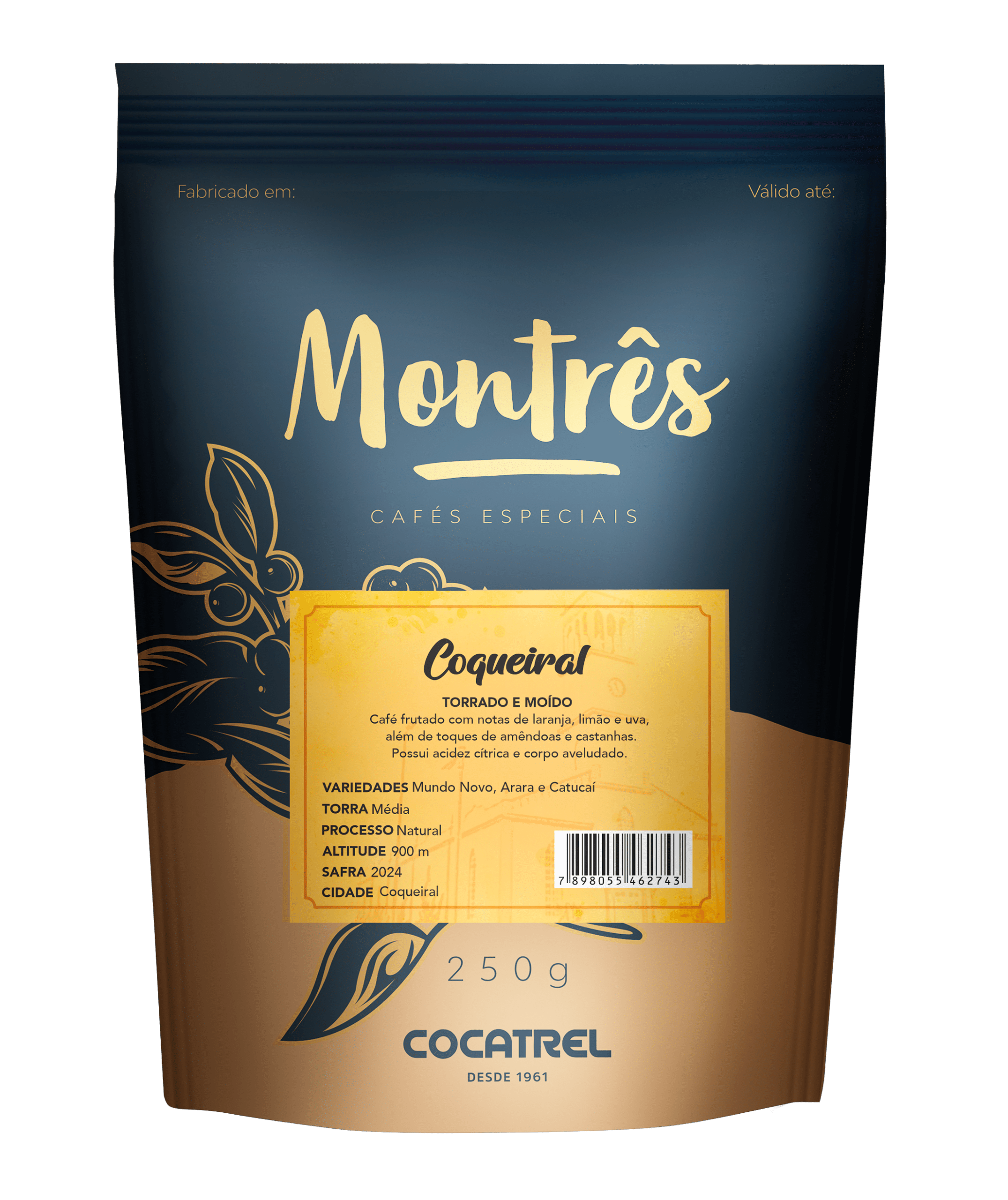 A linha Montrês é feita com cafés 100% arábica, especiais, classificados de acordo com a metodologia da Associação de Cafés Especiais (SCA). São rastreados por variedade e origem (microclima). A versão Coqueiral é frutado com notas de laranja, limão e uva, além de toques de amêndoas e castanhas. Possui acidez cítrica e corpo aveludado. Cafés cuidadosamente selecionados desde a origem, tornando a sua experiência única a cada xícara. Tudo para que você eleve a um novo patamar o seu conceito sobre cafés especiais. Produzidos no Sul de Minas Gerais, os cafés Montrês utilizam, como matéria-prima, os melhores grãos especiais de café 100% arábica, produzidos de acordo com os princípios do programa 4C. Um encontro de aromas e notas que vai surpreender.